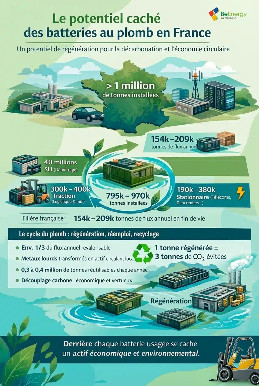 Le parc français de batteries au plomb constitue un gisement industriel stratégique, encore largement sous-exploité sous l’angle de la régénération. La France dispose d’un parc estimé entre 795 000 et 970 000 tonnes, avec un renouvellement annuel de 154 000 à 209 000 tonnes. Ce stock représente une véritable « mine urbaine », structurée, récurrente et parfaitement tracée par la réglementation sur les déchets d’équipements électriques et électroniques (DEEE).